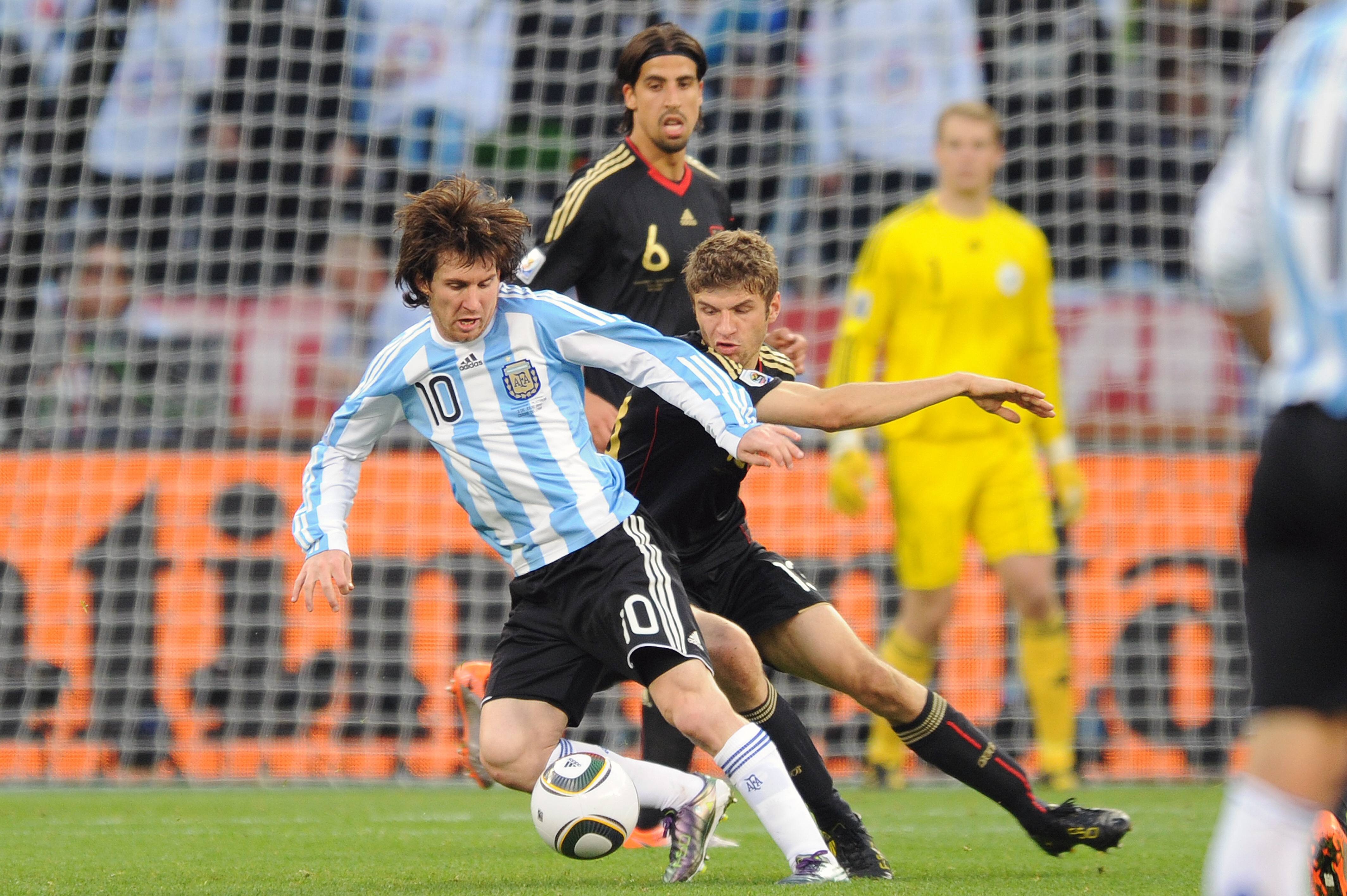 2010年南非世界杯,德国队在1/4决赛中4-0大胜阿根廷,比赛中梅西在一次停球时手球在先,随后皮球弹到穆勒手上,梅西向裁判投诉穆勒手球,裁判向穆勒出示黄牌。这导致穆勒累积黄牌停赛错过对阵西班牙的半决赛,最终德国队在半决赛中0-1不敌西班牙被淘汰。